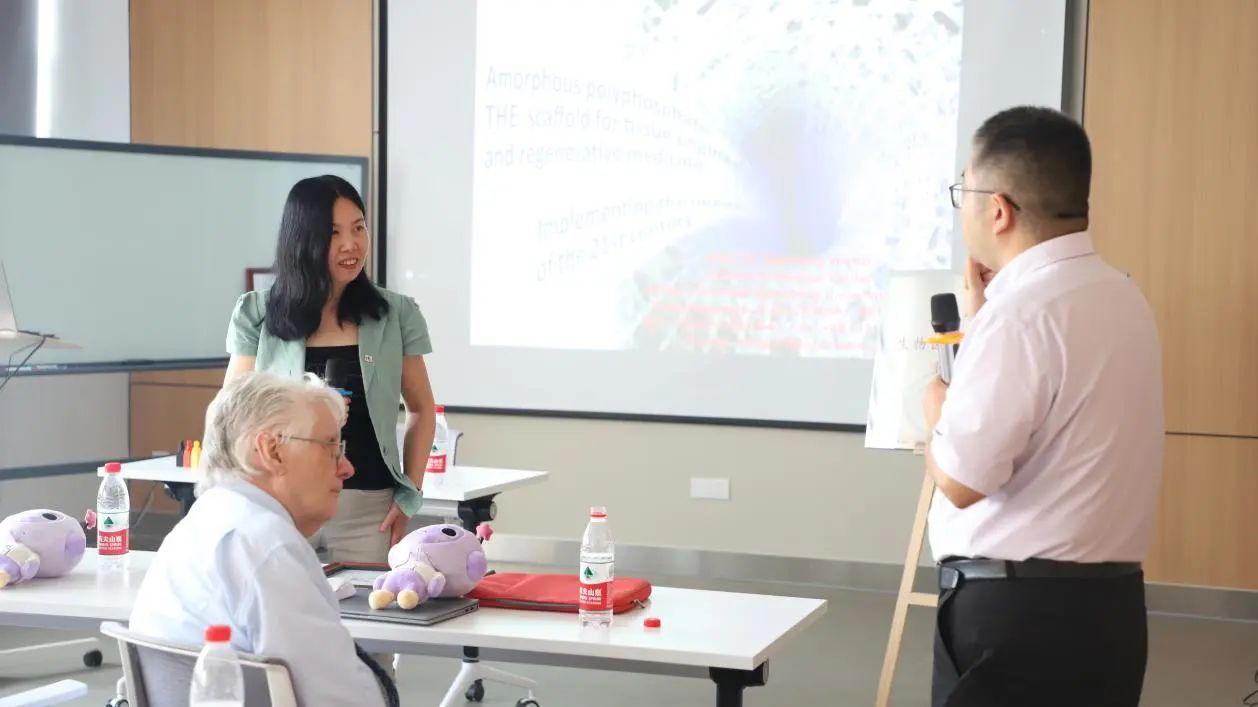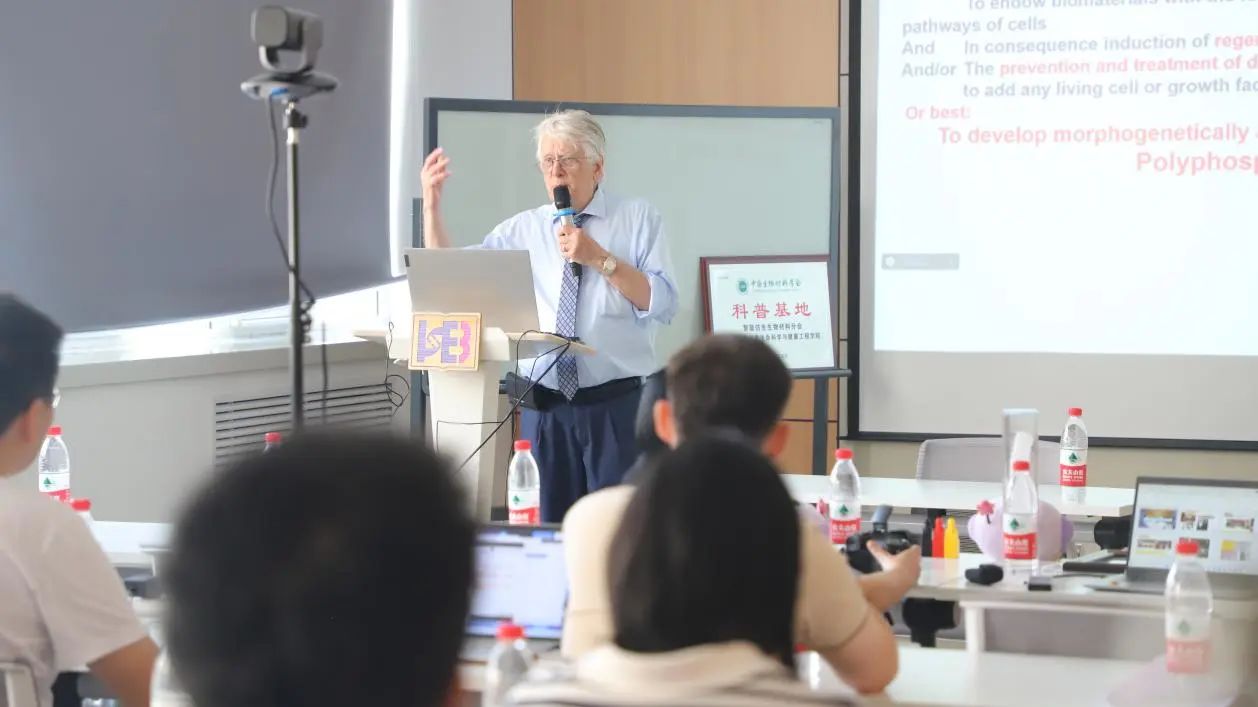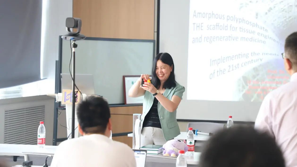 Müller教授对生物体骨组织重建方法进行了分享与讨论,从生物矿化的机制开始,循序渐进的讲解了聚磷酸盐是如何被生物体利用,进而转化为人体骨,对转化过程中所需的酶、蛋白质及能量的储存与释放等作了简洁明了的介绍,最后对生物医学与组织再生领域的未来发展发表了自己的见解。Müller教授的讲座幽默生动,与学生之间深度对话,并给予学生们极高评价:“You are excellent!” 。