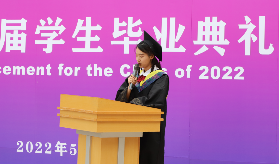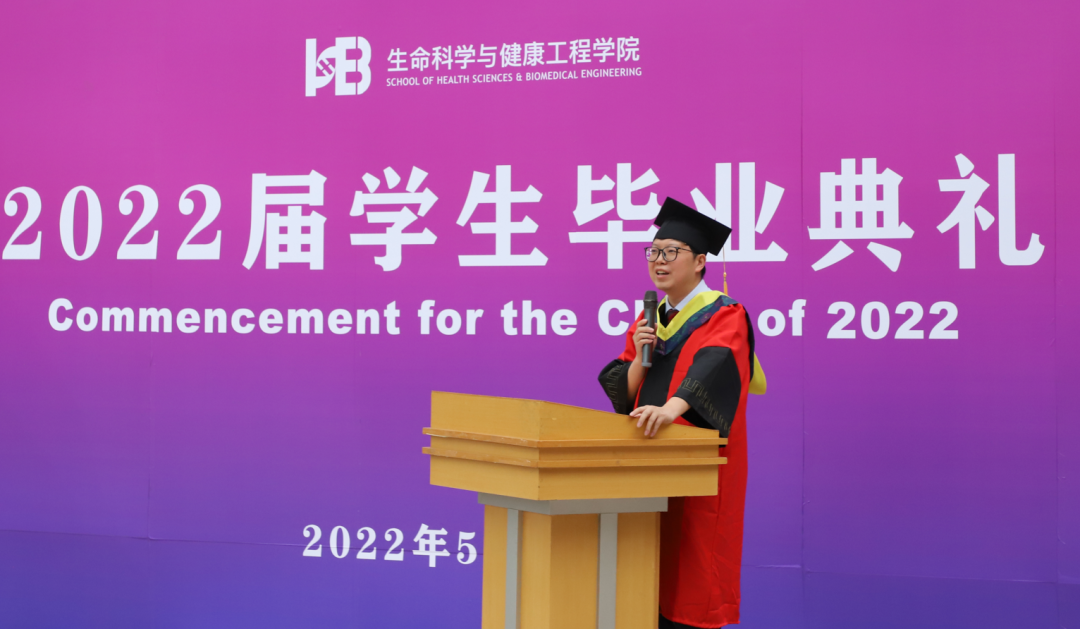 2022届毕业生代表、生医181班陈昕彤回顾了四年青春记忆里不可复制的感动、感恩与感悟,代表全体毕业生感谢学院教师提供的所有帮助,祝愿一起走过大学时光的同学今后的道路能够熠熠生辉,号召全体2022届毕业生日后以优异的成绩向母校报告!