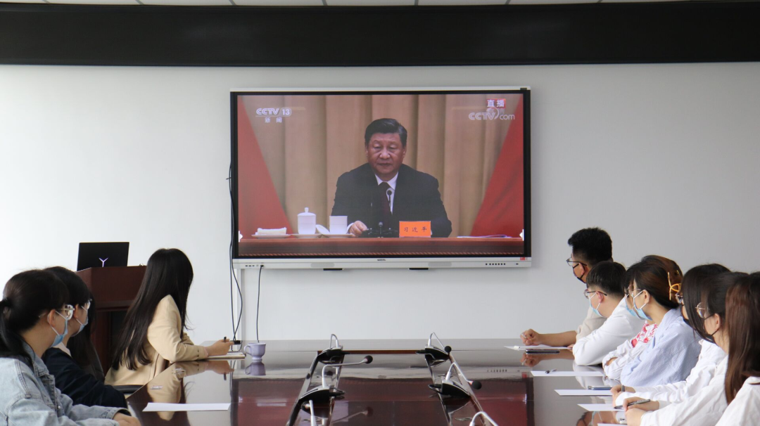 5月10日10时,庆祝中国共产主义青年团成立100周年大会在北京人民大会堂隆重举行,中共中央总书记、国家主席、中央军委主席习近平出席大会并发表重要讲话。50net永乐高在科技楼组织观看直播活动,党委副书记张轶和学生代表共同学习习近平总书记重要讲话精神。